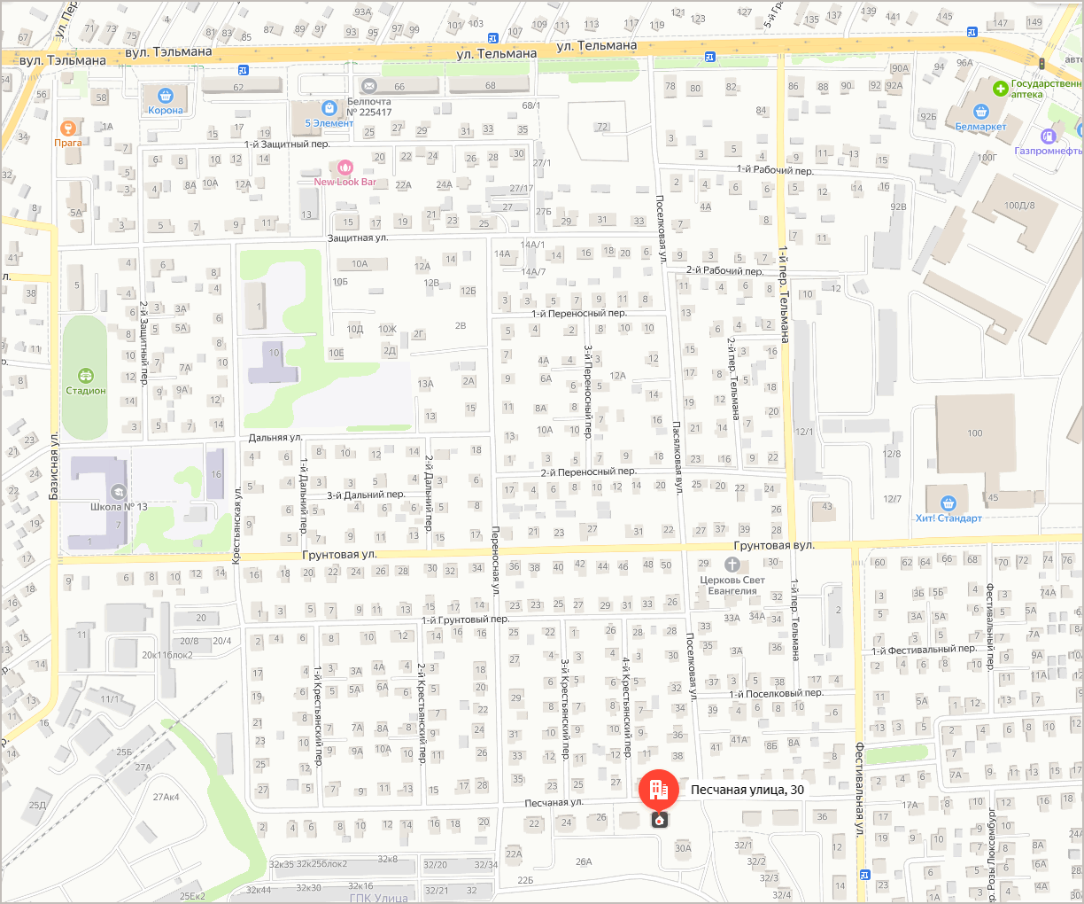 Если ехать из Центра по улице Тельмана, то за торговым центром «Радужный» свернуть направо в 1-й переулок Тельмана (это единственная асфальтированная улица между «Радужным» и Белмаркетом). Доехав до конца переулка, перед домом в торце улицы повернуть направо (50 м) и налево (50 м). На перекрестке будет Песчаная 30.
